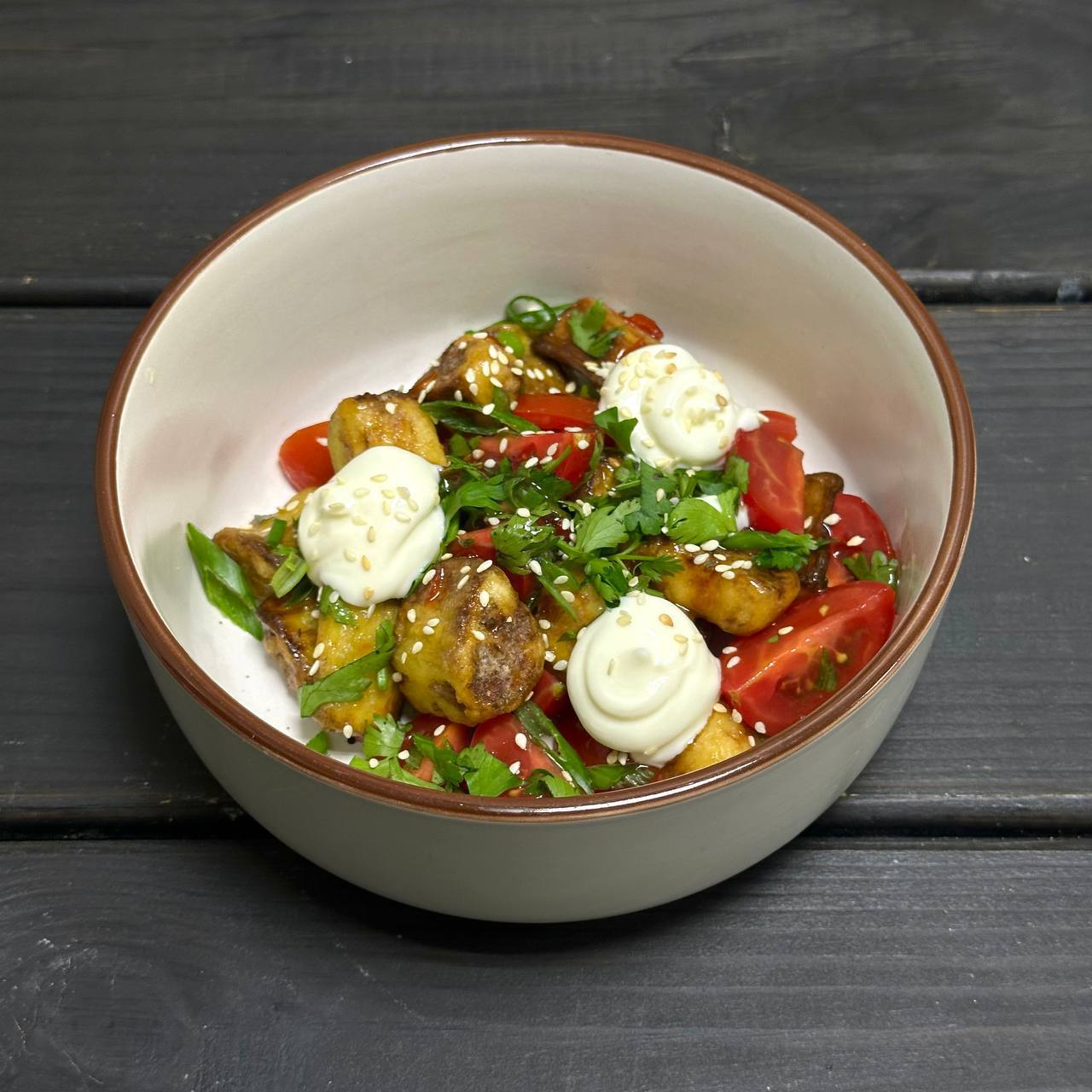 Салат с хрустящими баклажанами, муссом из имеретинского сыра, сладким чили соусом, томатами черри, зеленью и кунжутом