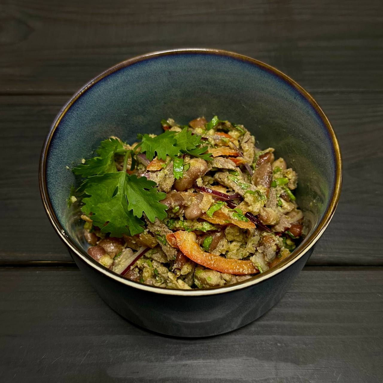 Салат «Тбилиси» — это популярный грузинский салат с говядиной, красной фасолью, сладким перцем, красным луком , кинзой и грецкими орехами. Его отличают свежий пряный вкус, ведь в него добавляются перец чили, чеснок и специи хмели-сунели. Заправляется салат традиционно растительным маслом и винным уксусом