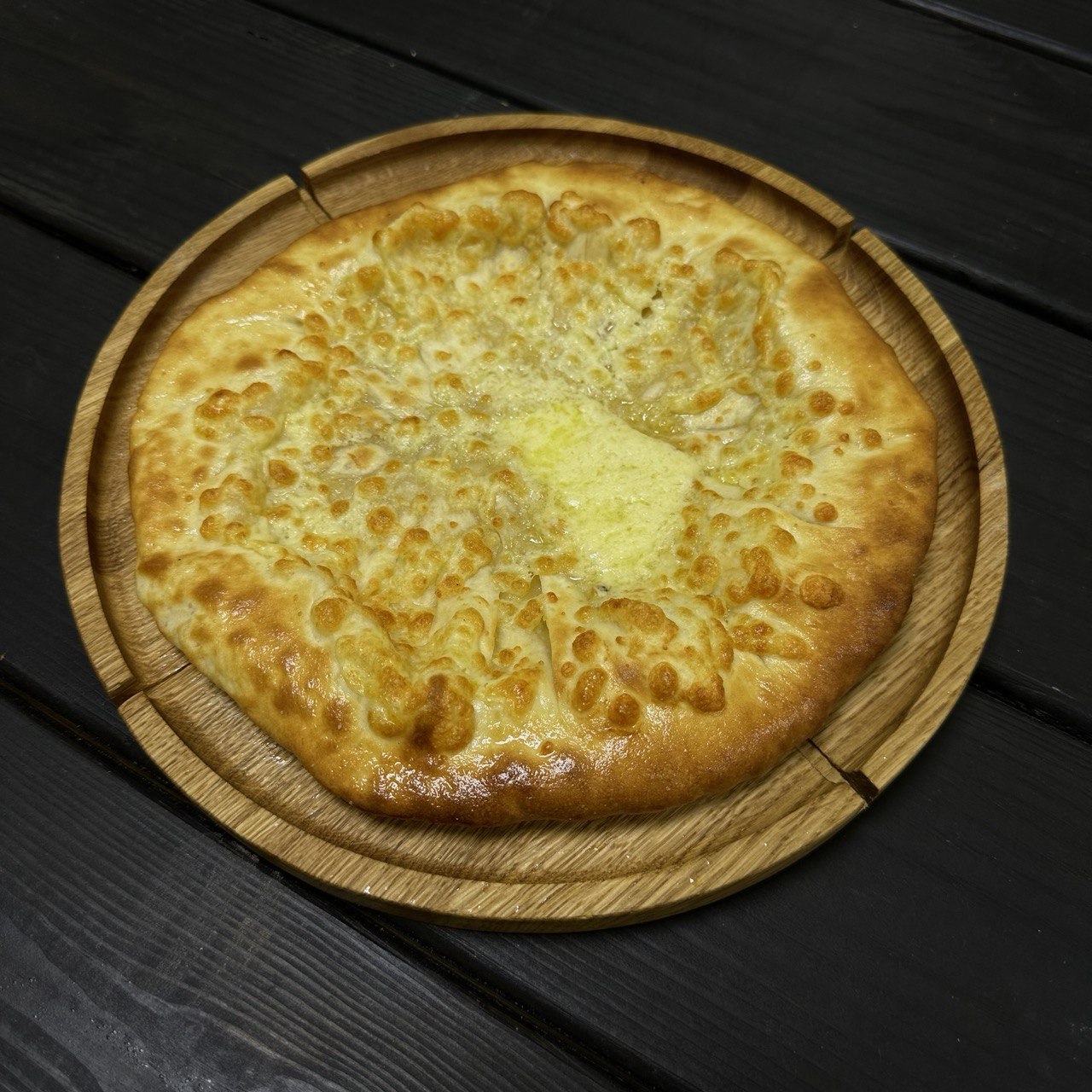 Традиционная грузинская выпечка круглой формы (диаметром 22-25 см) с сыром Сулугуни внутри и сверху.