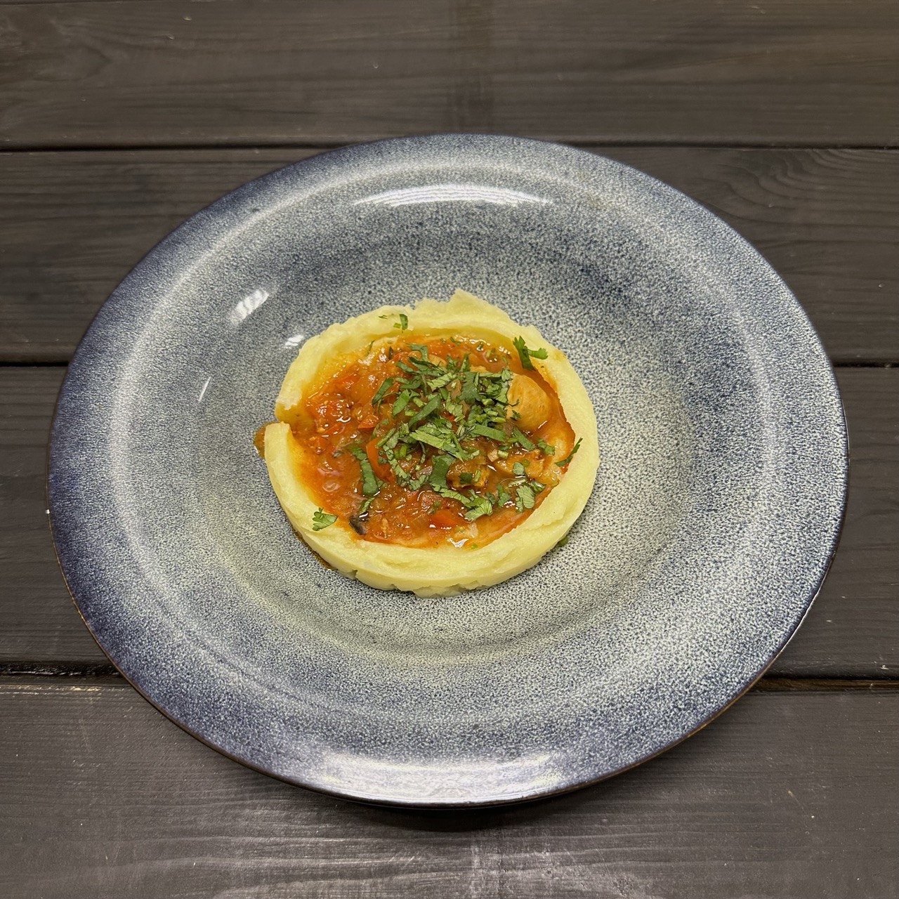 Грузинское блюдо из куриного филе в томатном соусе с картофельным пюре на гарнир