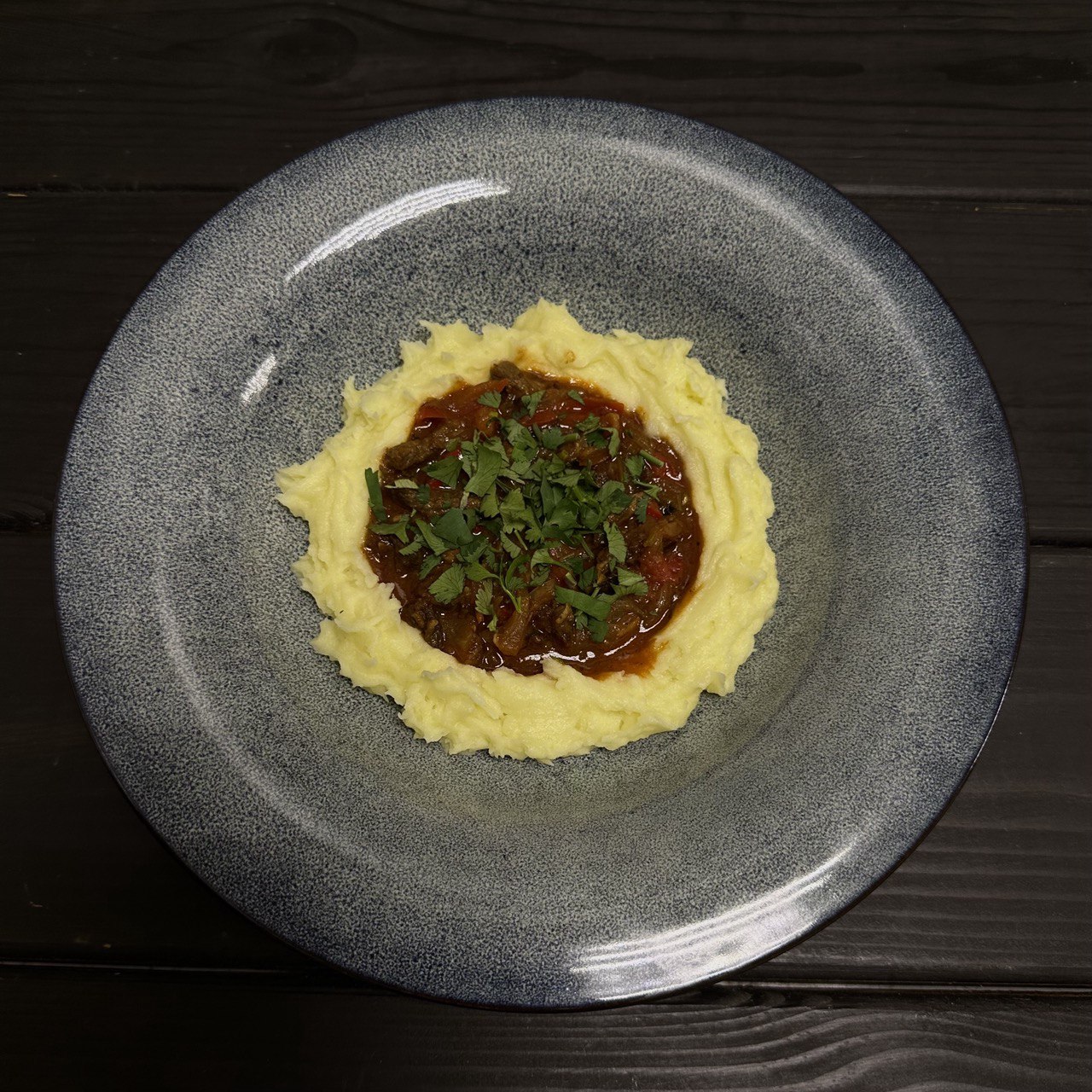 Нежная тушеная говядина с болгарским перцем и картофельным пюре на гарнир